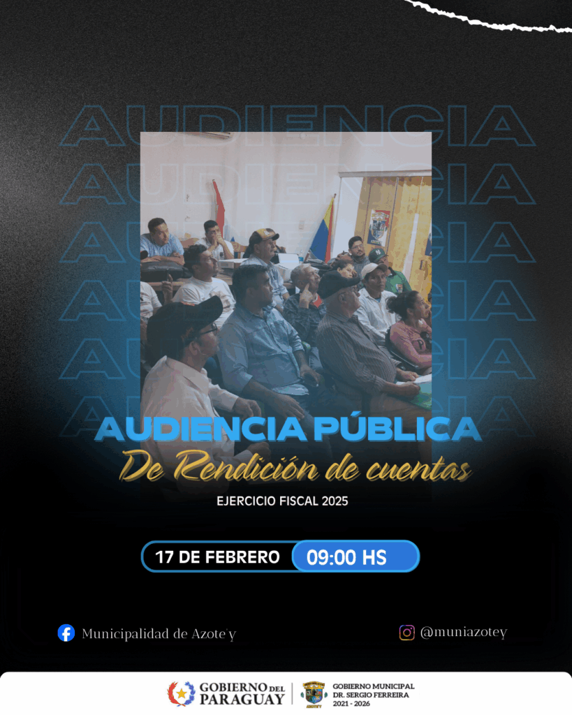La Administración Municipal a cargo del Dr. Sergio Ferreira Portillo invita a toda la ciudadanía interesada a la Audiencia Pública de Rendición de Cuentas correspondiente al Ejercicio Fiscal del año 2.025 que se realiza anualmente dando cumplimiento a lo estipulado en la Ley N° 5.590/2019, la cual modifica el artículo 69 de la Ley N° 3.966/10 «Orgánica Municipal».