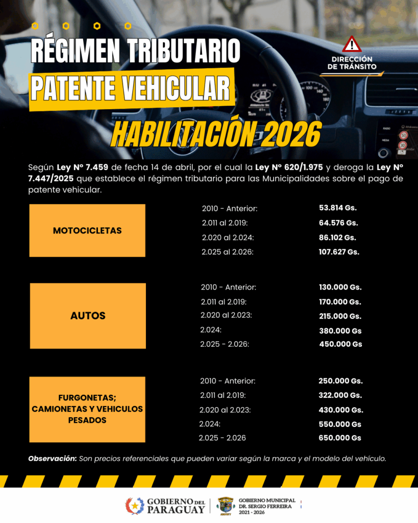 La Municipalidad informa a la ciudadanía sobre los precios de la habilitación vehicular basado en la Ley N.º 7459, que establece que el monto a pagar en concepto de patente será del 0,3% sobre el valor imponible del vehículo, en está publicación se detallan los nuevos precios referenciales para llevar en cuenta.