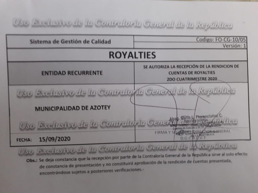 La administración del Lic. Hilario «Lalo» Morinigo, presento en tiempo y forma los informes de rendición de cuentas correspondientes al 2do. cuatrimestre del ejercicio fiscal año 2020. y Certificada por la Contraloría General de la Republica en fecha 15/09/2020