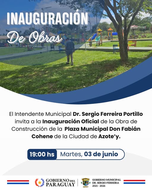 El día martes 3 de junio a partir de las 19:00 horas se llevará a cabo la Inauguración Oficial de la Obra »Construcción Plaza Municipal Don Fabián Cohene» de nuestra ciudad.