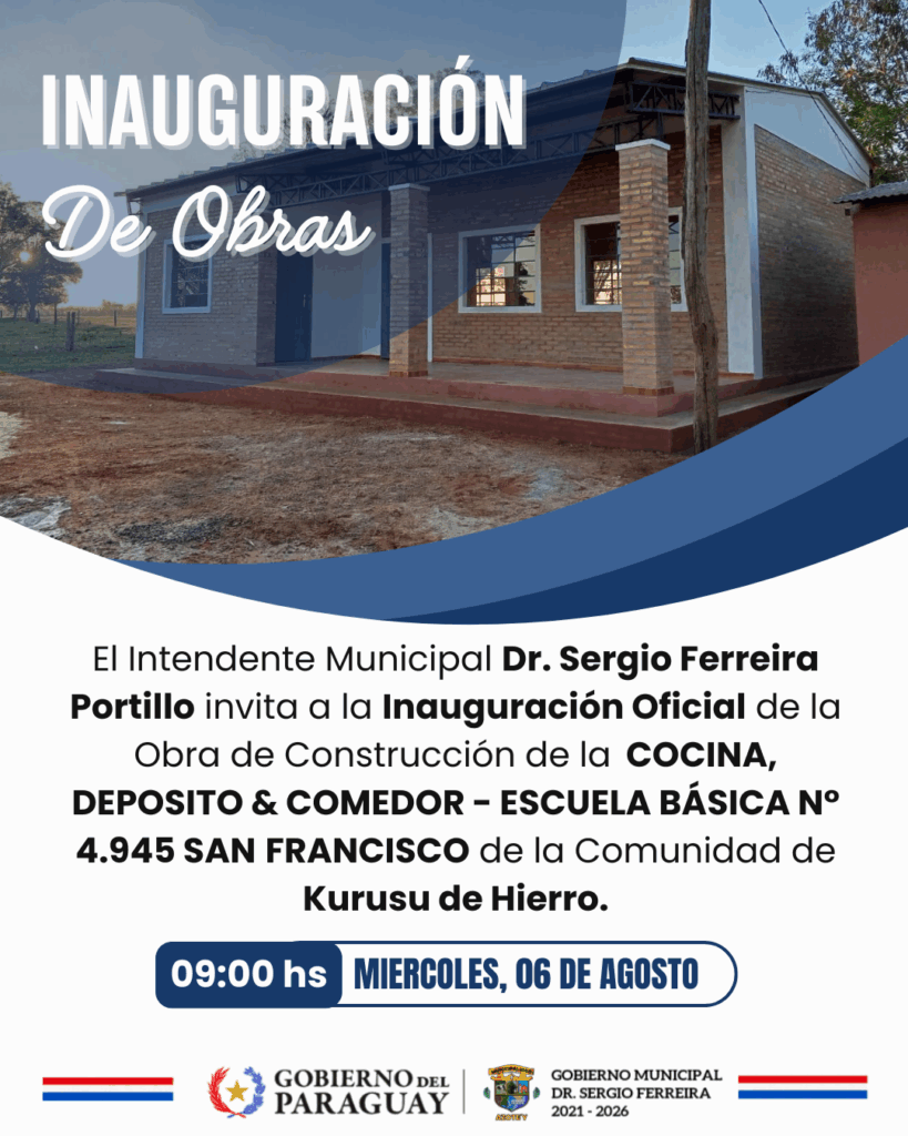 El día miércoles 06 de agosto a partir de las 09:00 horas se llevará a cabo la Inauguración Oficial de la Obra »Construcción de Cocina, Depósito & Comedor – Escuela Básica N° 4.945 San Francisco de la Comunidad de Kurusu de Hierro.