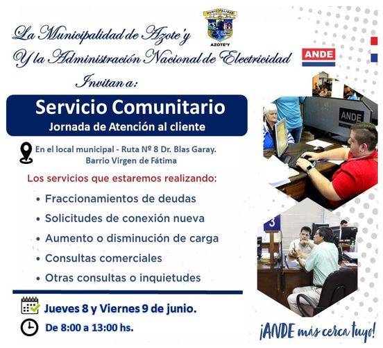 En otra jornada de servicio a la comunidad en la fecha indicada en la invitación personal de la ANDE estarán presentes en el local de la sede municipal para atender quejas o preguntas que tengan acerca del servicio de electricidad.