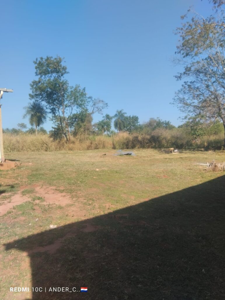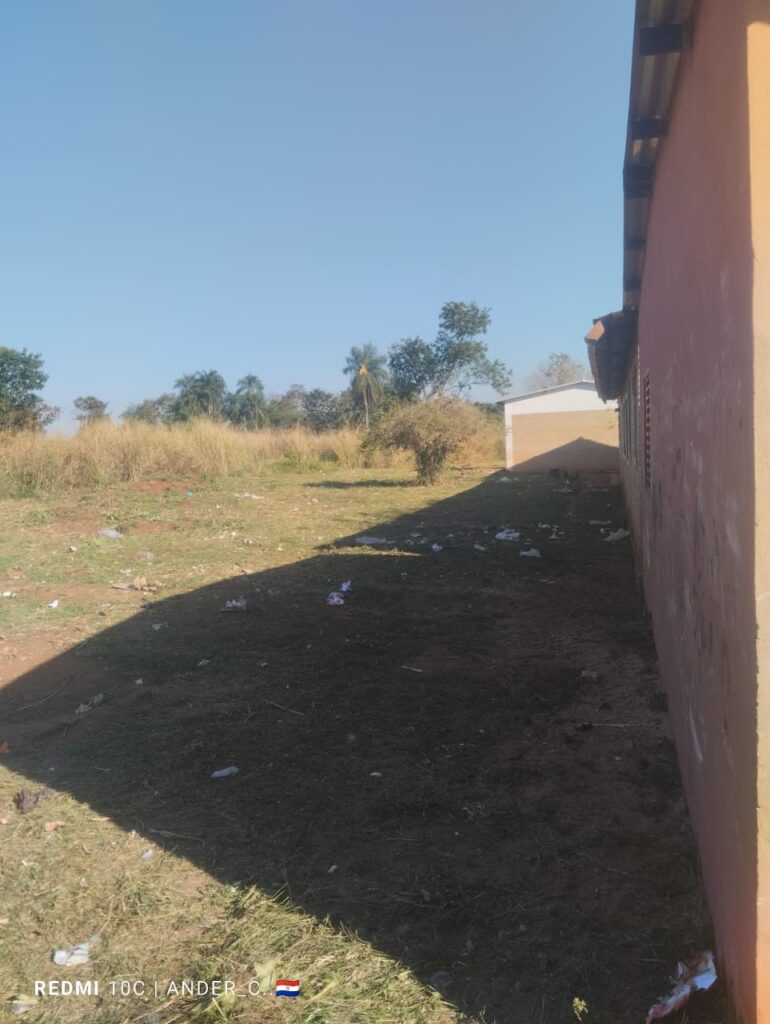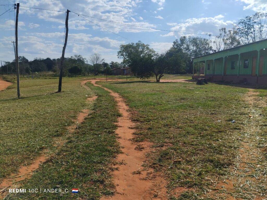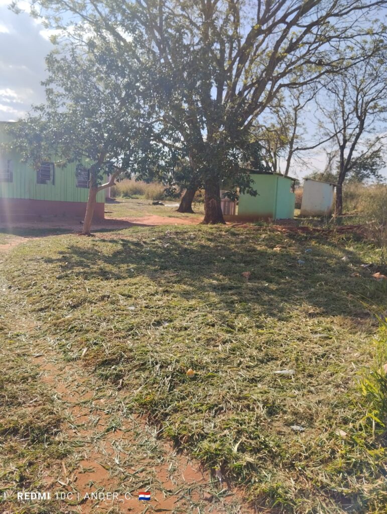 Trabajos de corpida y limpieza del patio e inmediaciones de la Escuela Básica N° 5.834 de la Comunidad Indígena Vy’a Pave realizado por el funcionario integrante del Equipo de Aseo & Limpieza.
