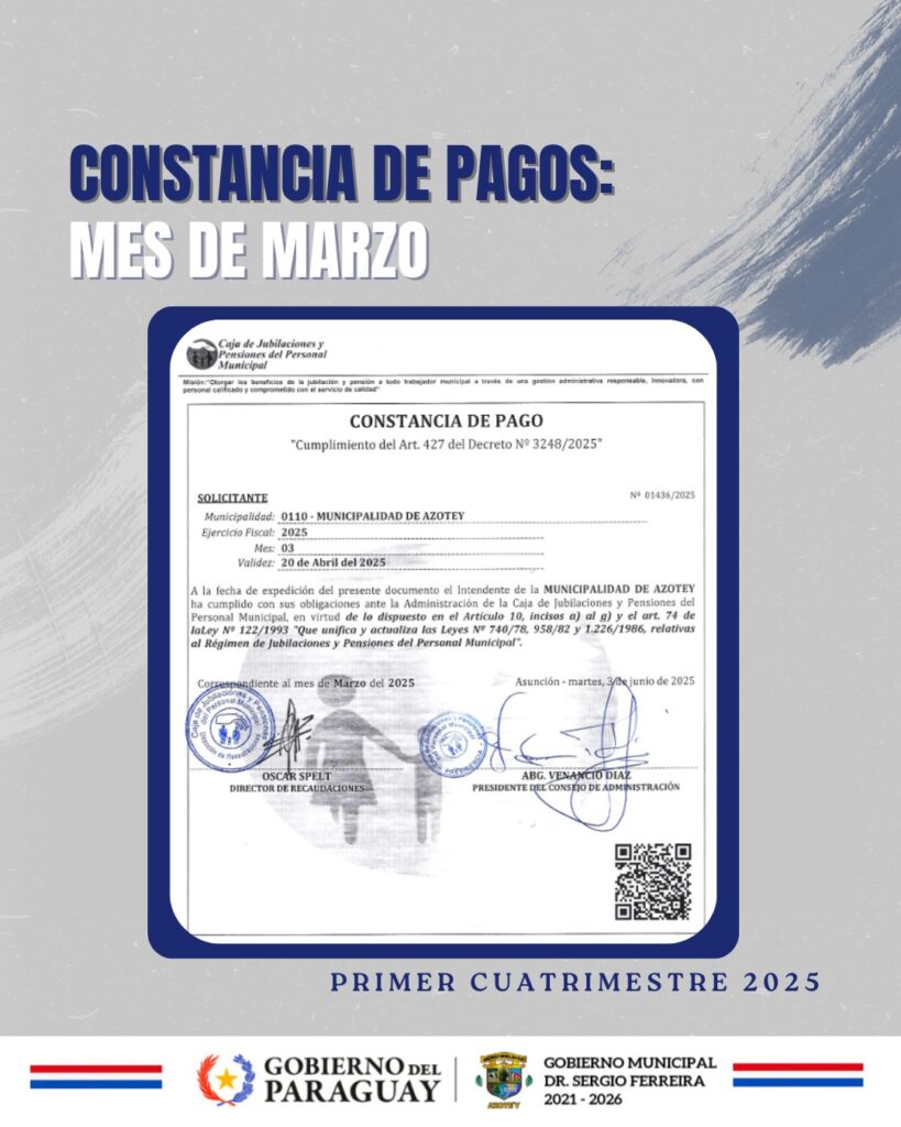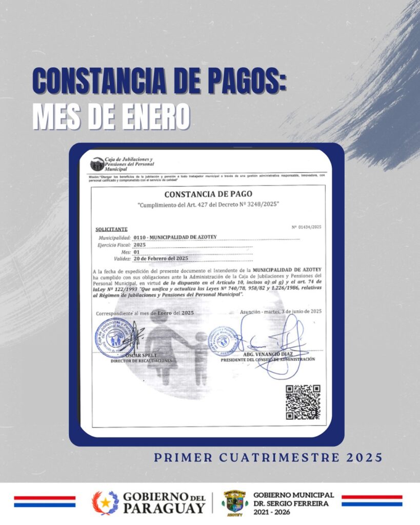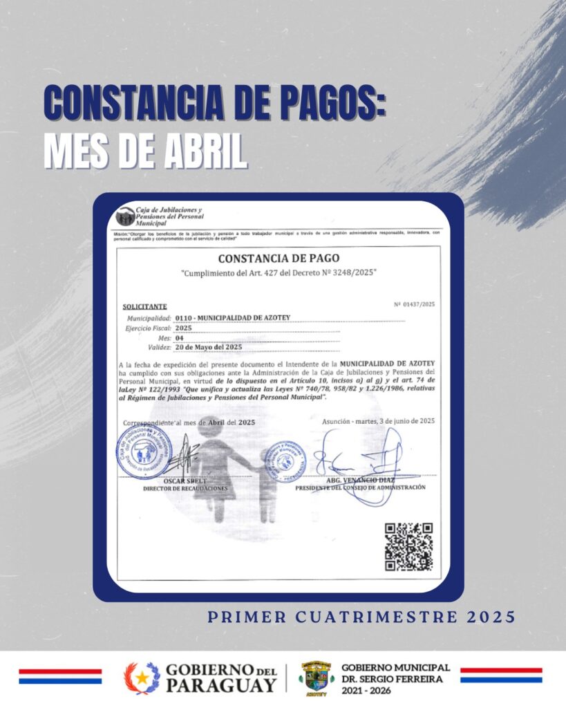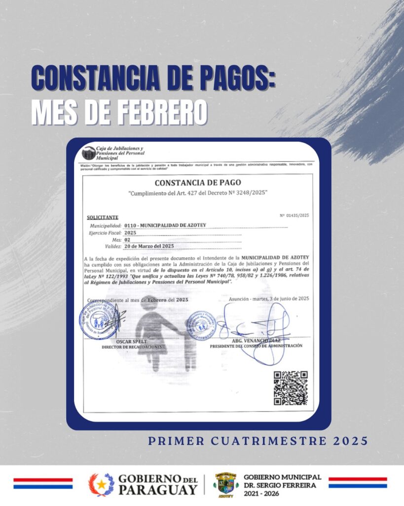 La Administración Municipal a cargo del Dr. Sergio Ferreira Portillo cumple con el compromiso de estar al día con los aportes a la Caja de Jubilaciones y Pensiones del Personal Municipal correspondiente al Primer Cuatrimestre del año 2.025.