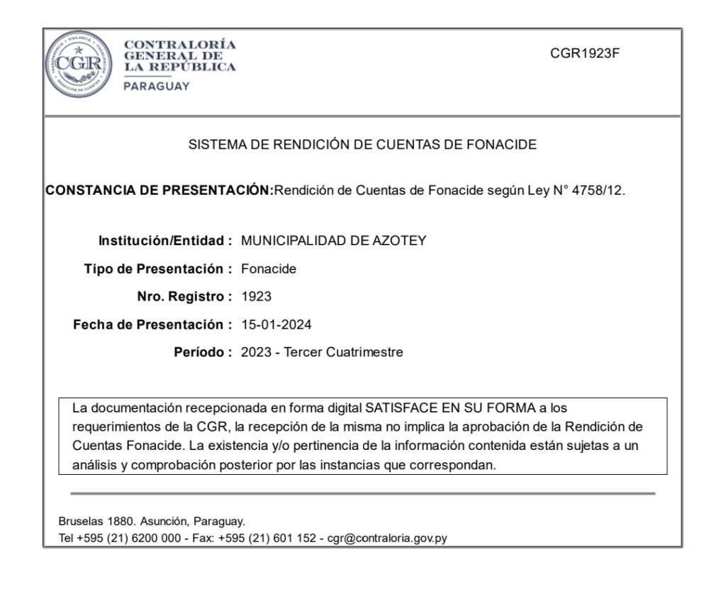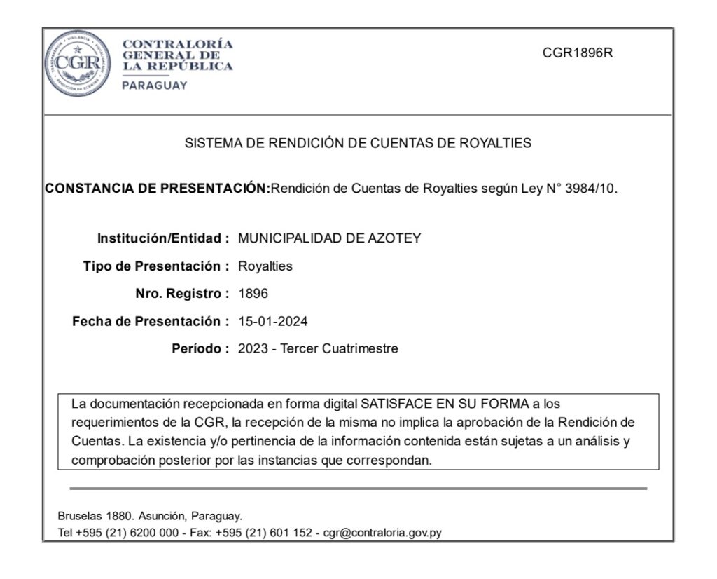La Municipalidad bajo la administración del Dr. Sergio Ferreira Portillo cumple con la presentación de los informes a la Contraloría General de la República en lo que se refiere al uso de los fondos de Royaltìes y Fonacide correspondiente al 3er cuatrimestre del año 2023.