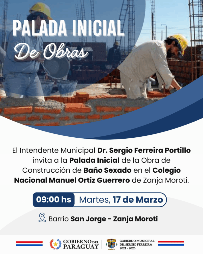 La Administración Municipal a cargo del Dr. Sergio Ferreira Portillo invita a toda la ciudadanía a participar en el Acto de la Palada Inicial para la Obra de Construcción de Baño Sexado en el Colegio Nacional Manuel Ortiz Guerrero de la Comunidad de Zanja Moroti.