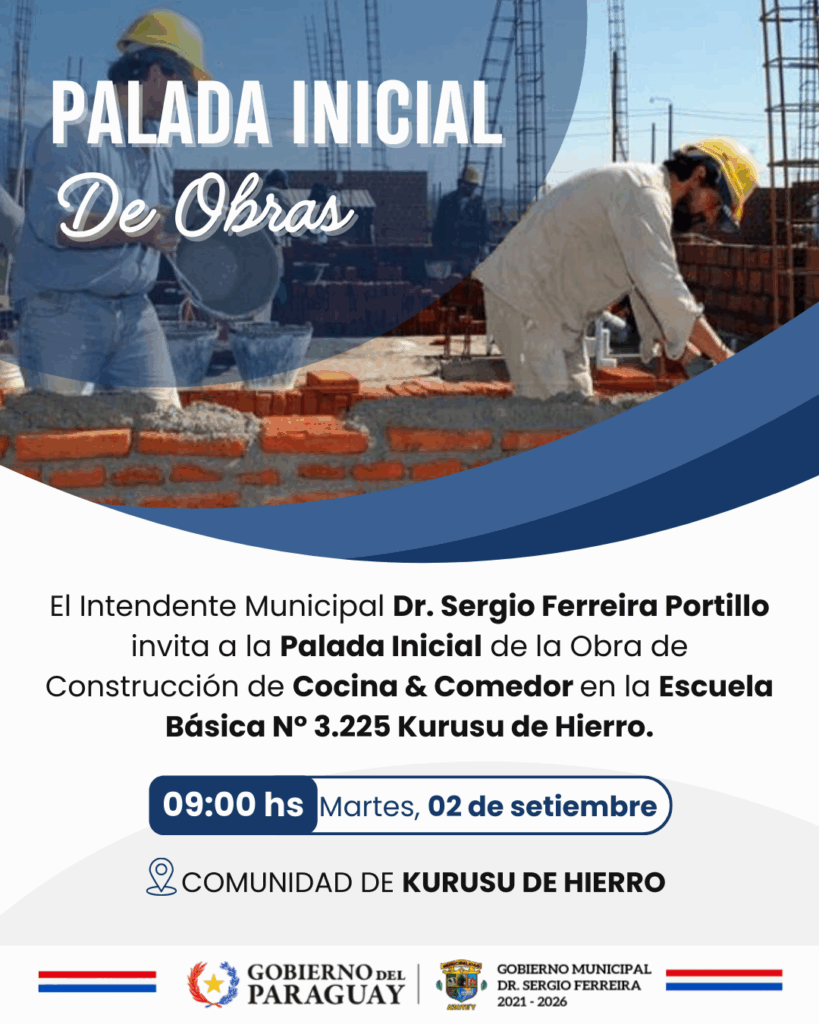 La Administración Municipal a cargo del Dr. Sergio Ferreira Portillo invita a toda la ciudadanía a participar en el Acto de la Palada Inicial para la Obra de Construcción de Cocina con Comedor en la Escuela Básica N° 3.225 de la Comunidad de Kurusu de Hierro.